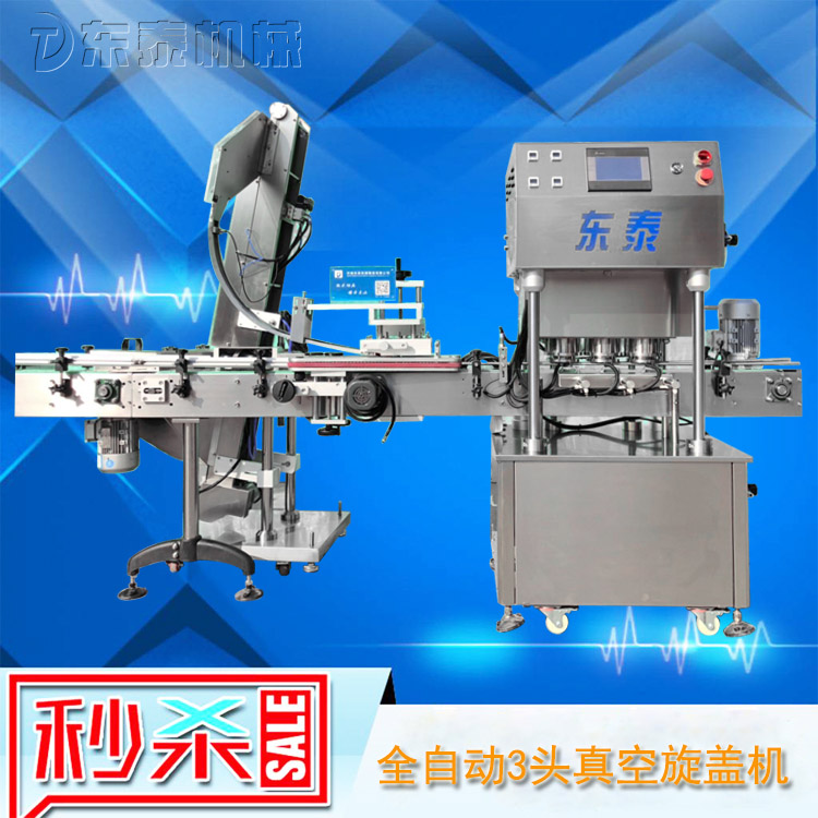 該直線式真空旋蓋機是東泰機械結合用戶使用的情況,摒棄了傳統轉盤式真空旋蓋機的弊端,研制開發的新型高效設備,設備自動檢測到兩個瓶子蓋子進入到雙頭真空旋蓋機內,旋蓋機彩色顯示屏會實時顯現旋蓋狀況,整機多點檢測,當進口無瓶無蓋、出口堵塞、定位不準、瓶身傾倒均自動停機。單個旋蓋頭達到的真空度都可以單顯示,單調整
